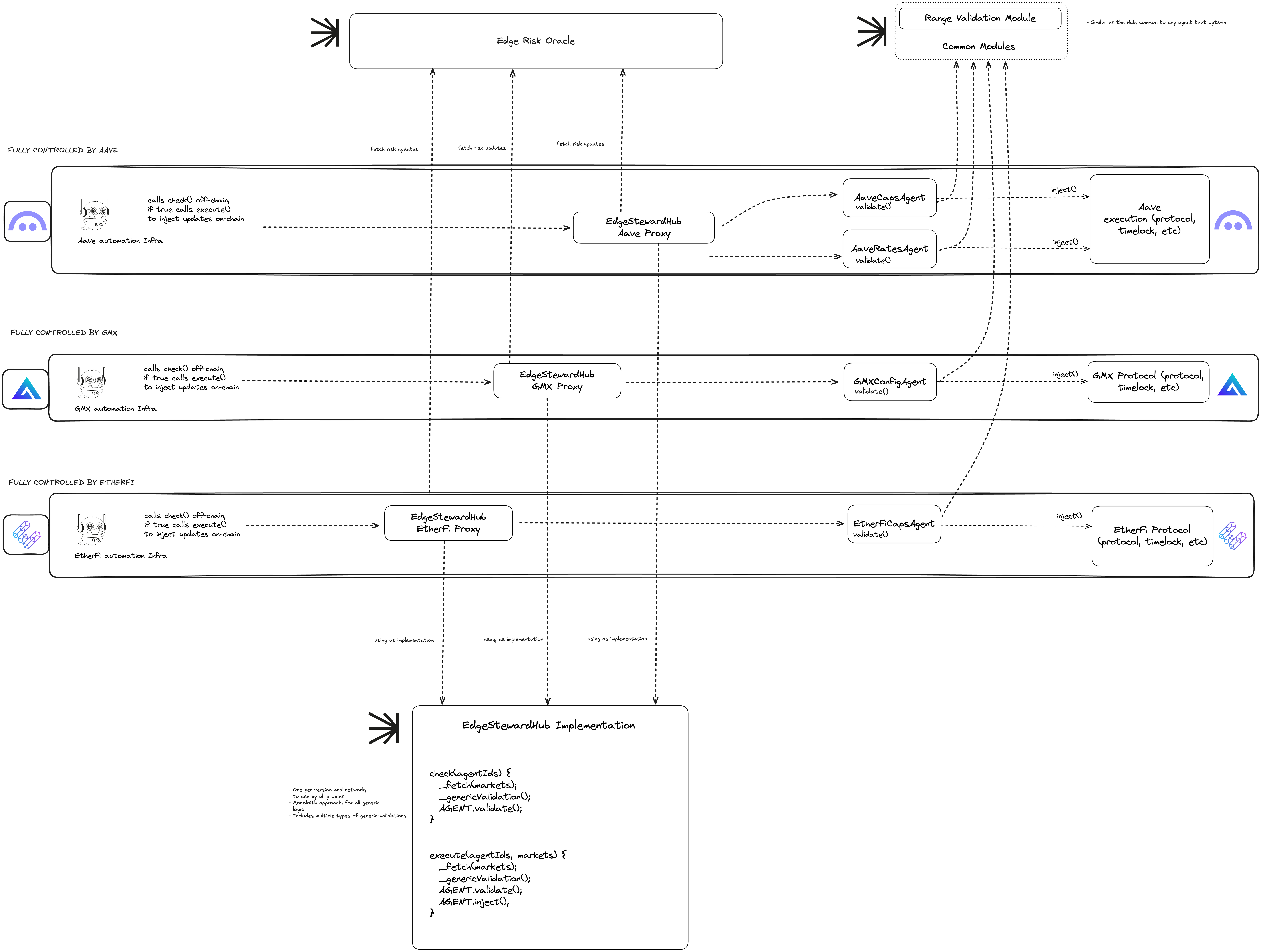 The ChaosAgentHub serves as a central hub for multiple agents, each with protocol-specific configurations. It holds all agent configurations with access control for agent admins to update them. For example, you might have one agent for supplyCapUpdate, another for slopeOneUpdate, and so on.